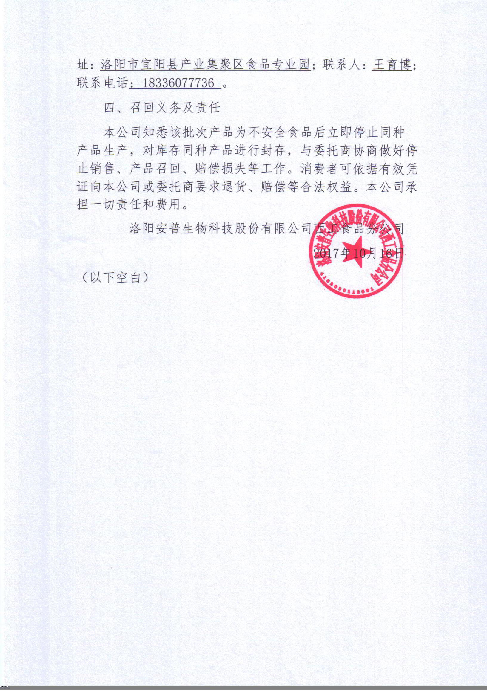 洛陽安普生物科技股份有限公司西工食品分公司產(chǎn)品召回公告